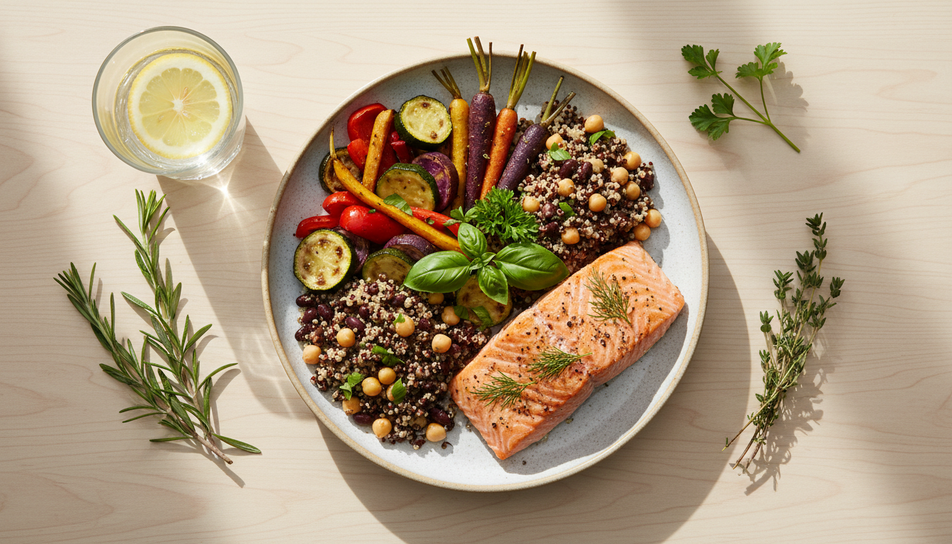 - ¼ Teller: Sättigungsbeilage (Kartoffeln, Vollkornreis, Vollkornnudeln, Quinoa)